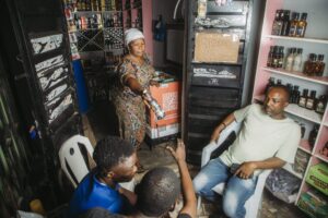 At a bustling market in the Iyana Ipaja area of Lagos, close to the Otta border, Adegoke Tolulope Salimot is taking orders for fish and other produce from customers at her frozen food stall. She has plenty in stock for the day and the week ahead, so her focus is on making sales and customer service. In the neighborhood of Igando, Lagos, Chukuswa Doris has set up a few chairs outside her food & supply store. It’s not technically a cafe or restaurant – but because it’s a hot day and her fridge is full of cold drinks, plenty of customers are taking the opportunity to sit down for a break and have something to drink while catching up over conversation.